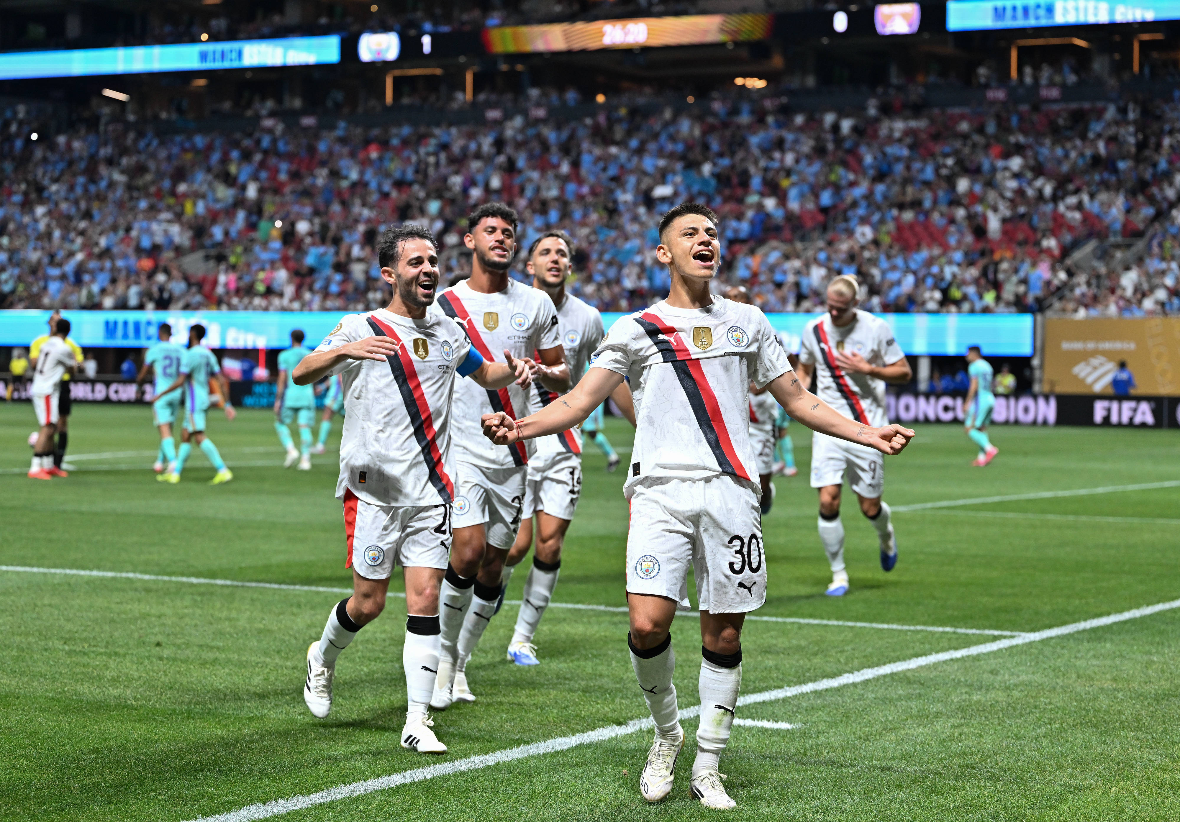 北京时间6月23日上午9:00,世俱杯小组赛G组第2轮,曼城和阿联酋阿尔艾因展开对决。上半场比赛,曼城由京多安首开纪录,随后埃切维里世界波为球队扩大领先优势,哈兰德补时阶段再进一球,半场结束曼城3-0领先;下半场,京多安再进一球扩大比分,奥斯卡-鲍勃、谢尔基破门,最终曼城6-0大胜阿尔艾因。此役过后,曼城与尤文图斯同积6分,提前晋级淘汰赛阶段。两队净胜球都是8个,但尤文图斯总进球数多1个,曼城暂时排在小组第二。